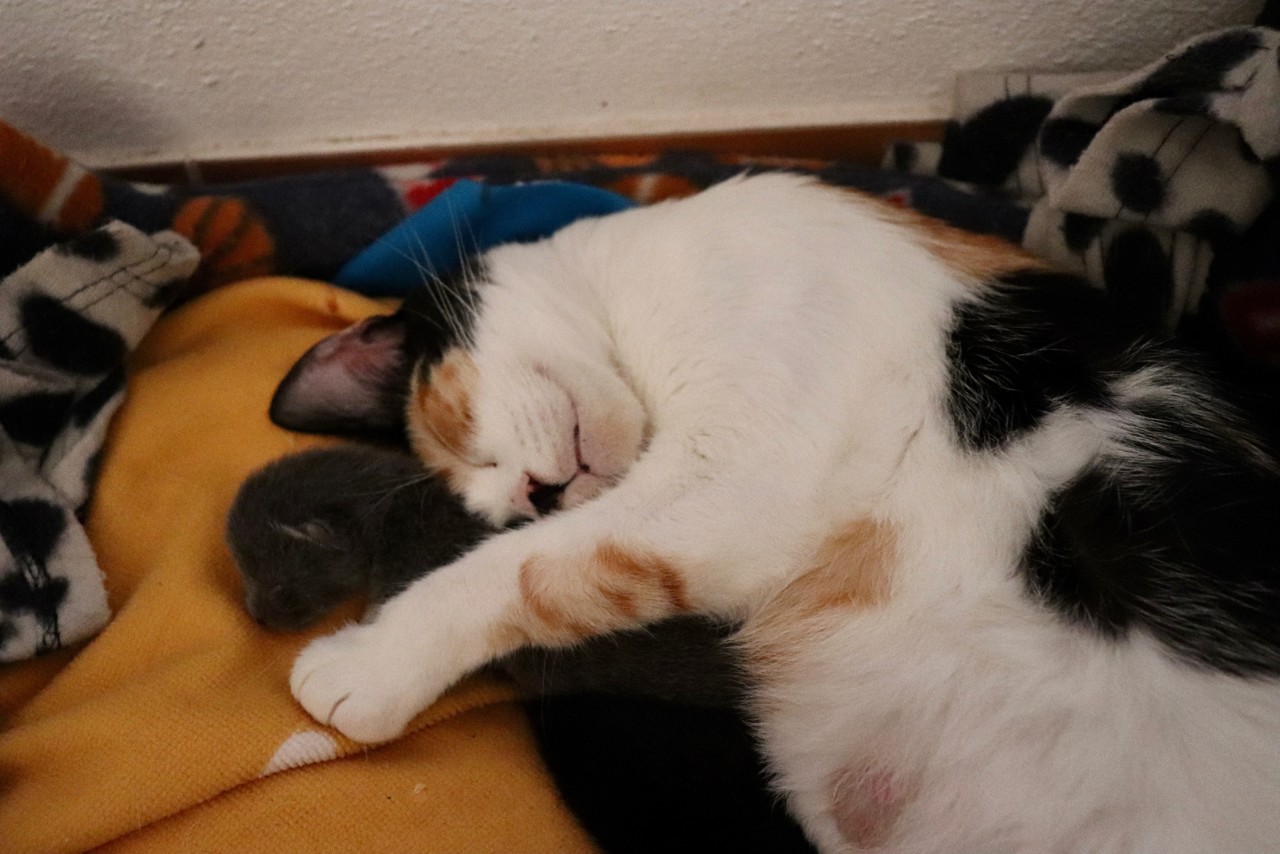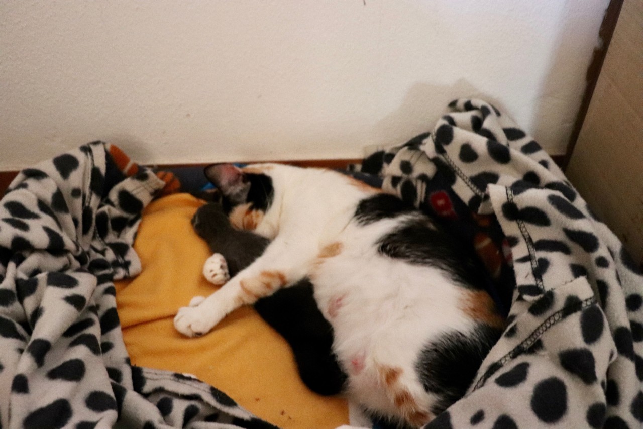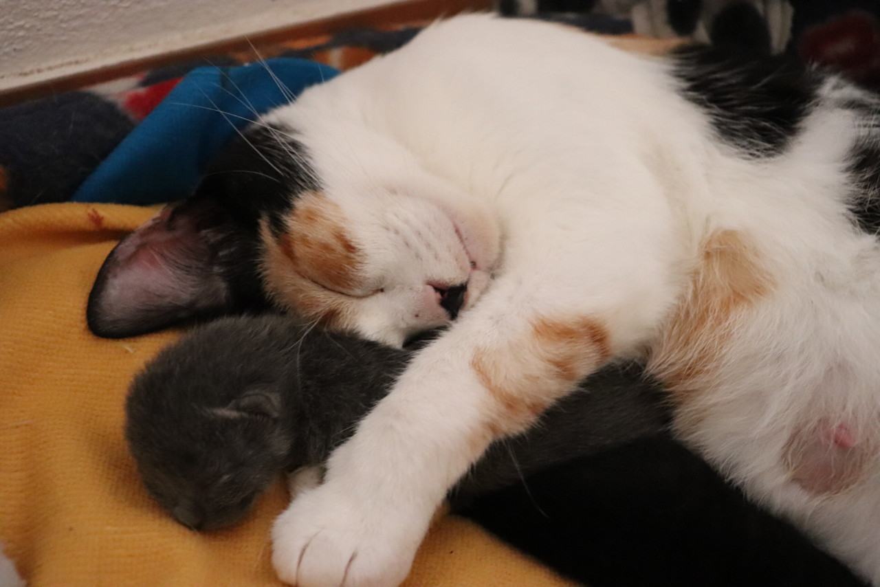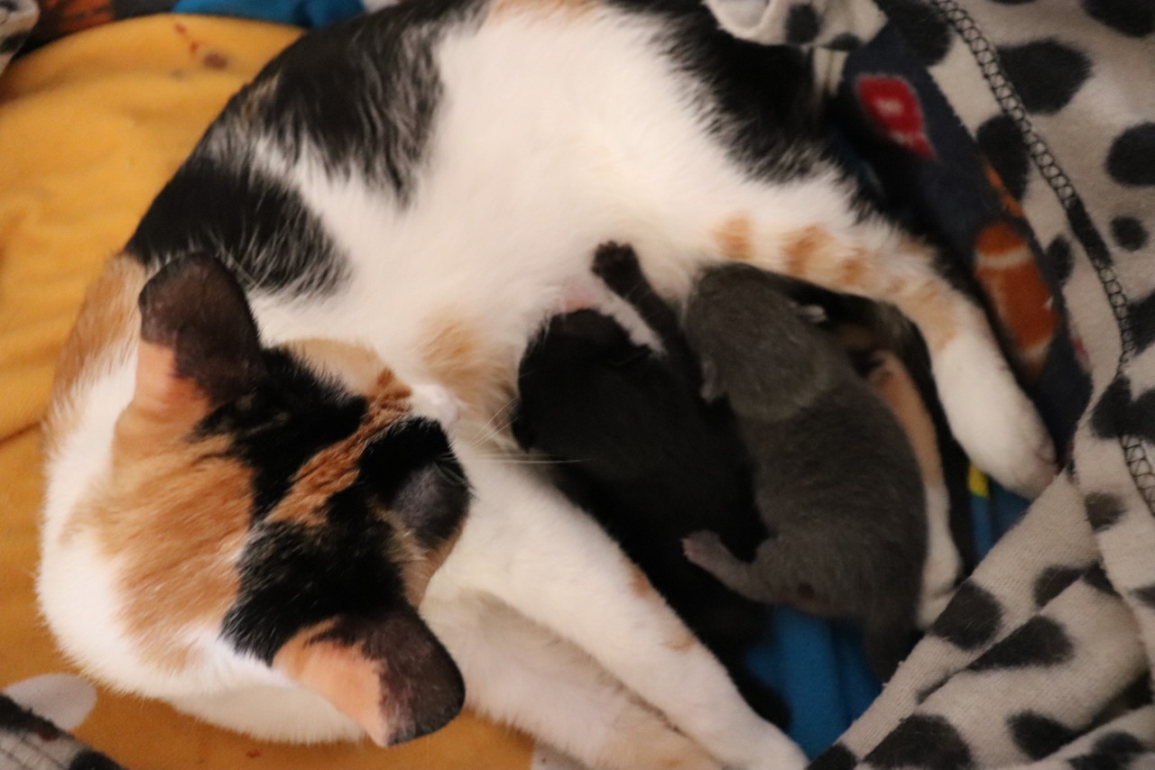 O parto correu bem, sendo natural e mágico! No entanto, há uma infelicidade nesta história. O último gatinho nasceu com uma abertura ao longo do ombro e com as patas traseiras não desenvolvidas (não está no vídeo). Liguei para a veterinária que me explicou que é normal acontecer na primeira ninhada e que a natureza acabaria por levá-lo durante a noite. Mas a pequena (mais tarde descobrimos o sexo) não nos abandonou e de manhã lá estava ela a pedir uma oportunidade à vida.