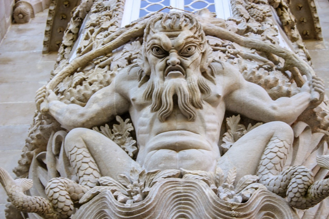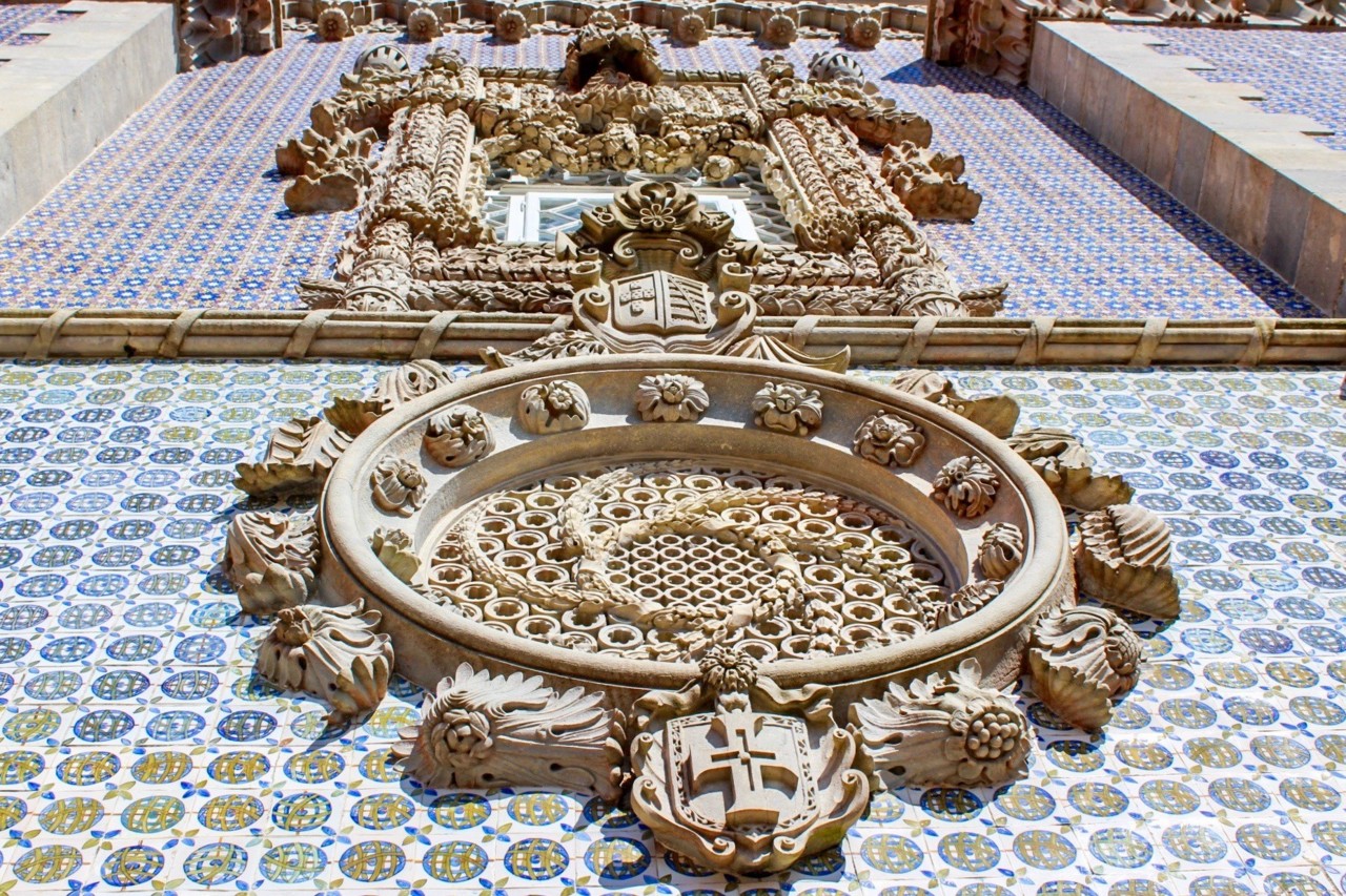 Como já disse o palácio tem uma concepção bastante especial porque os estilos são diversos e bastante diferentes. O claustro que nos lembra as catedrais góticas, as diversas guaritas (torres com frestas ou seteiras), as paredes revestidas com azulejos neo-hispano-árabes oitocentistas, uma janela (a do lado do pátio dos arcos) adaptada à janela do capítulo do Convento de Cristo e ainda a tal figura do Tritão que nos remete à alegoria da Criação do Mundo (meio homem meio peixe).