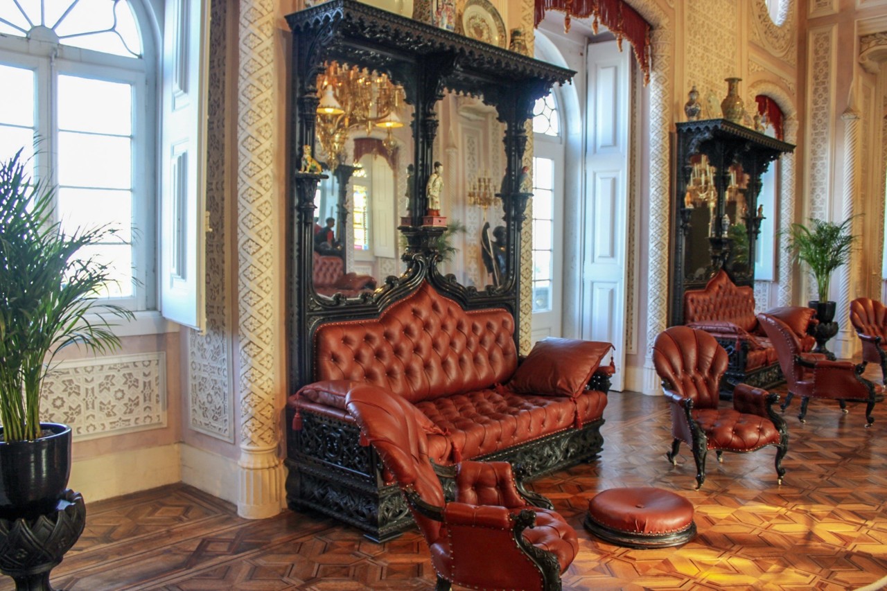 Mobiliário chinês com embutidos de madrepérola, jarras lacadas, cães de fó em porcelana, cadeirões, esculturas de bronze, mobiliário indiano, loiças da companhia das Índias, lustres, candelabros, pinturas a óleo, conjuntos de toilette, mil e uma coisas que fazem do palácio um lugar encantador e esplêndido.