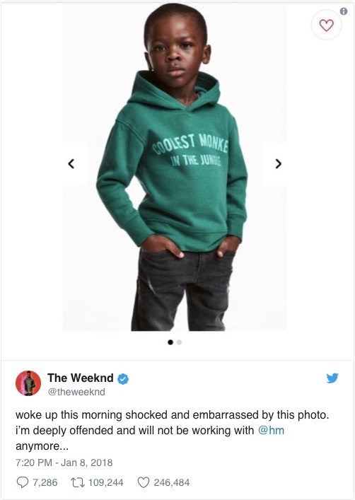 A H&M reconheceu a falha, retirou a fotografia e pediu desculpa : "Esta imagem foi removida de todos os canais H&M e pedimos desculpa a todas as pessoas que se possam ter sentido ofendidas".