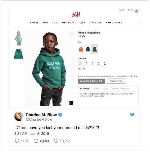 As redes sociais encheram-se de comentários e depressa se gerou a polémica sobre uma fotografia do catálogo online da loja de roupa H&M. Um menino negro vestido com uma camisola com as palavras " o macaco mais fixe da selva" estampadas.