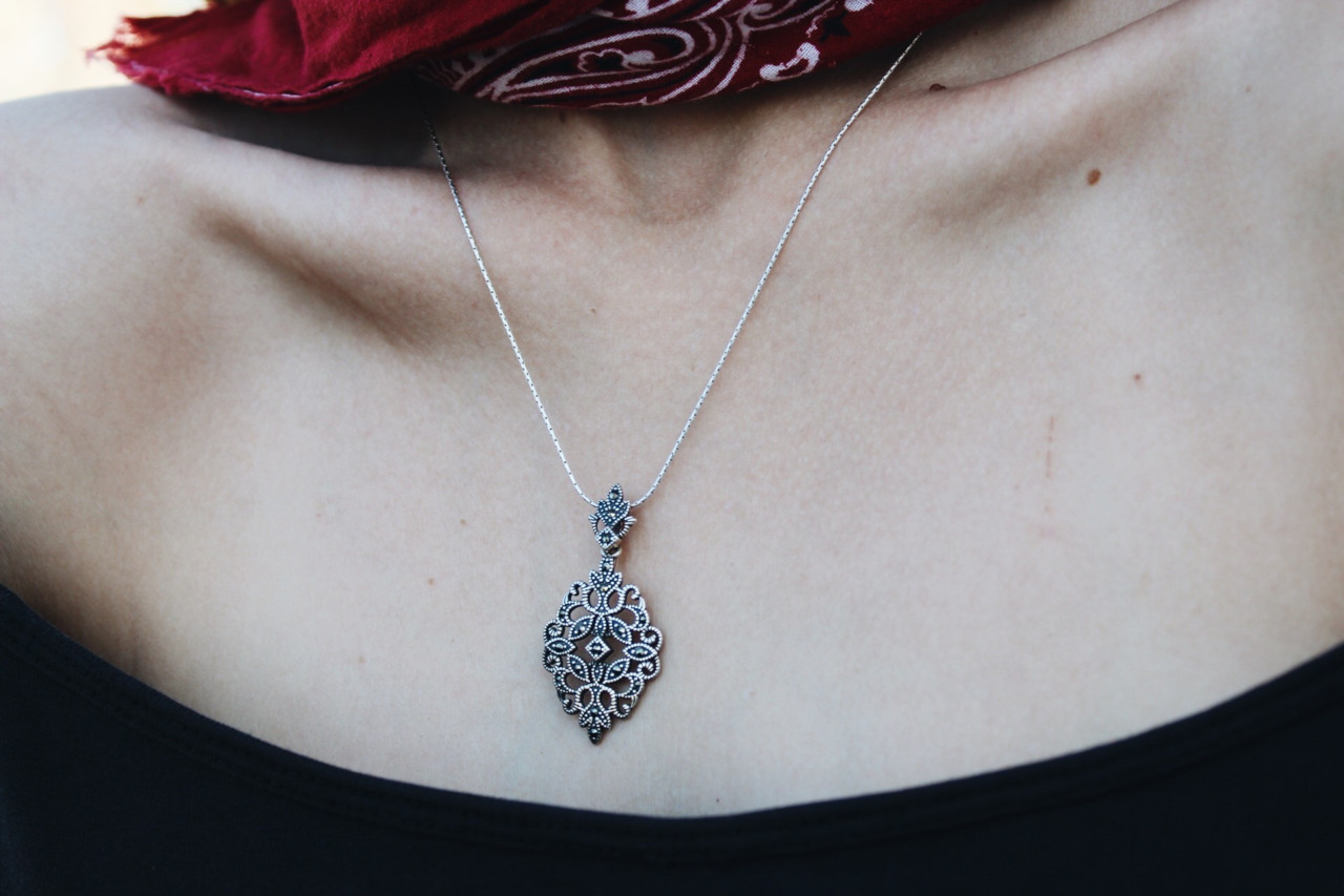 Também em prata de lei 925 e com os mesmos desenhos, o fio é maravilhoso. O pendente tem a mesma técnica dos brincos e a corrente é mais fina e de um prateado mais claro. Estas peças podiam ser too much juntas mas bem pelo contrário. São duas jóias que se completam e fazem um resultado muitíssimo requintado.